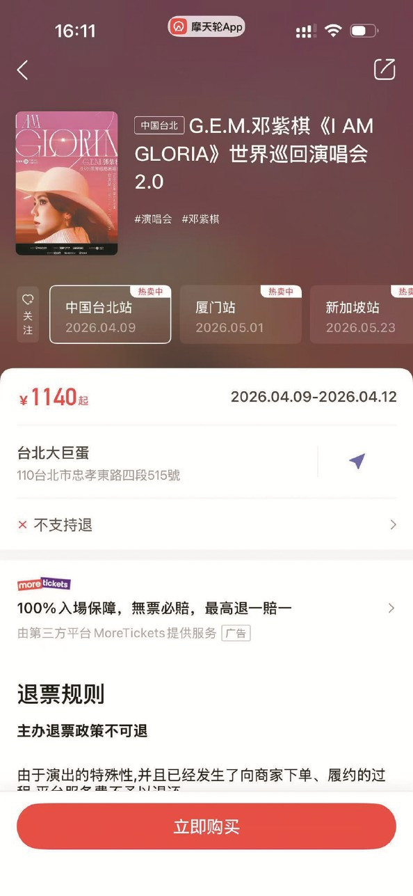 记者随后登录“摩天轮”App,找到了欣欣所购买的4月9日邓紫棋台北大巨蛋演唱会信息,平台显现该场次演唱会门票仍处于“热卖中”,页面退票礼貌显现为“不相沿退”,点击“办事证实”后弹出一转小字:“由于文学献技的很是性,本居品不相沿退票,敬请宥恕。”