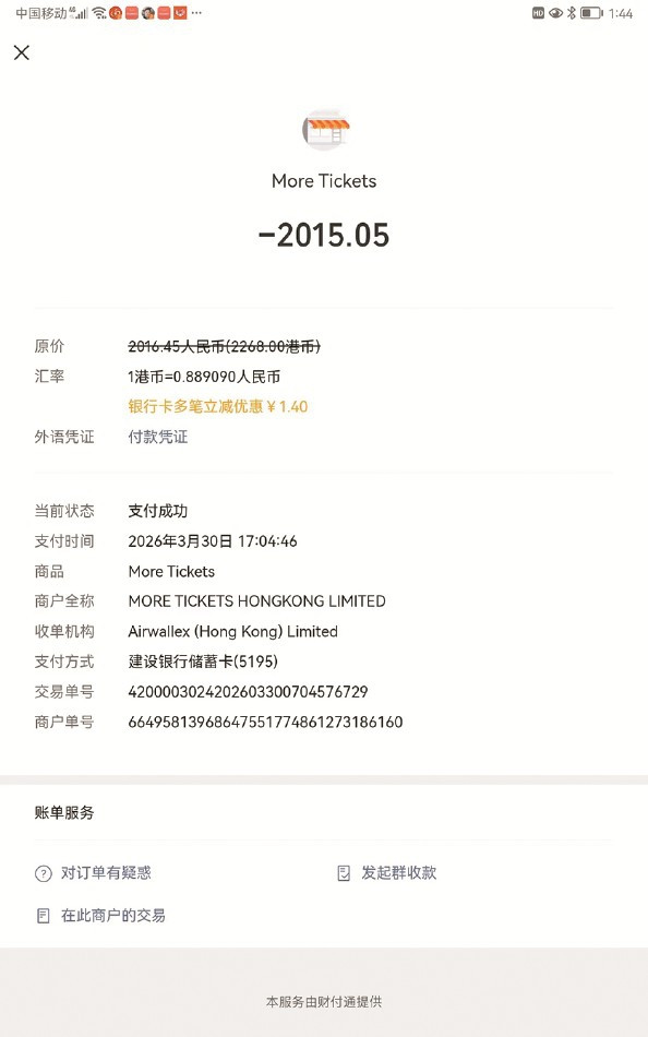 这么高深的日子苦熬着,没念念到一笔冒出来的订单再起海浪。据欧阳先生讲述,浮浅儿子卧床在家,开云app登录算作瘫痪仅有两根小拇指不错动掸,我便捷给儿子准备了一个平板电脑用作消遣,儿子与外界的毛糙一样也靠在平板电脑上打字。3月30日傍晚5点多,他霎时发现儿子的微信上有一条2000多元的支付记载,大惊之下,飞快点进去检察,发现是16岁的儿子在一家名为“摩天轮”的票务平台购买了一张4月9日邓紫棋的中国台北站演唱会门票。“儿子昔时就可爱听邓紫棋的歌,估量是看到了她的演唱会信息,不小心点进去的。”欧阳先生讲,儿子的微信绑定了她的银行卡,卡里的入款是爷爷奶奶外公外婆给她存进去用作济急的钱,没念念到却被购买了演唱会门票。