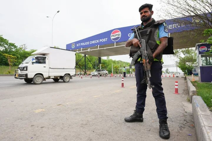 4月17日,警方在巴基斯坦齐门伊斯兰堡的一处稽察点握勤。新华社记者陈泽国摄