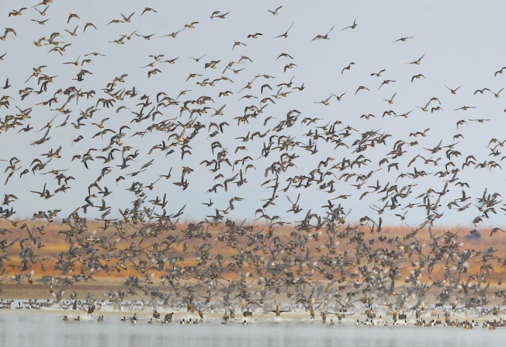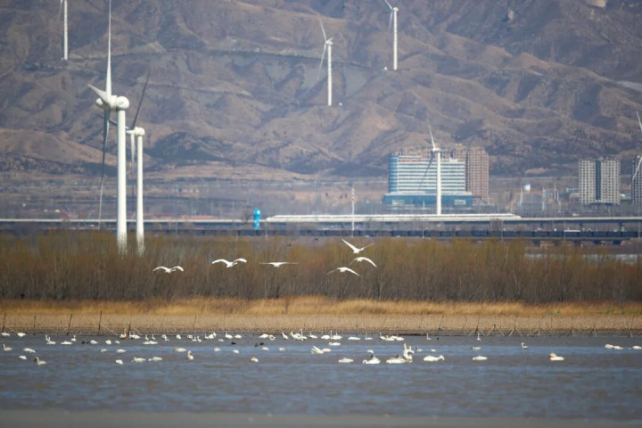 脚下,官厅水库又迎来了最吵杂的季节。除了天鹅,还有无数的豆雁、鸿雁、白额雁、赤麻鸭、罗纹鸭、针尾鸭,鸥类、鸻鹬类和大型涉禽也来了。灰鹤相比心急,大要一半照旧离开北京连接向北飞,目前约3000只还在官厅水库流连,作念临了的休整。