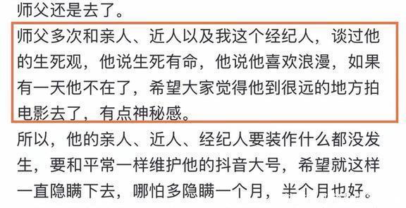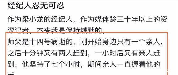 牙东谈主说:师傅是14号走的,那会儿身边惟有一个亲东谈主,过了十分钟又来了两个东谈主,一小时后又有其他亲东谈主赶到。