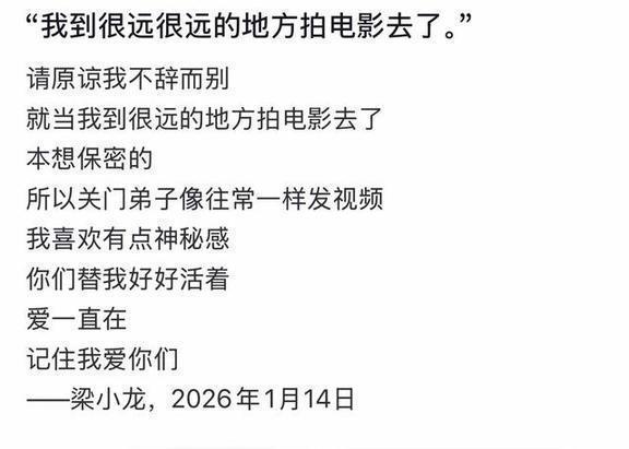 梁小龙赔本,对家里东谈主来说确凿个千里重的打击。终末但愿他洪福齐天,就当他去远处拍电影了!