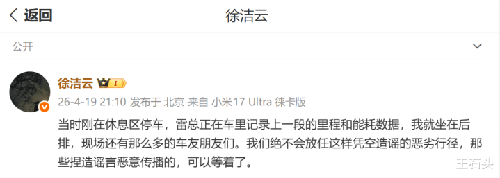 当今小米集团公关部总司理徐洁云,东谈主家我方站出来辟谣了,一分彩app官方最新版下载说那时他本东谈主就坐在车后排!要果真维权,他能那么淡定坐内部?