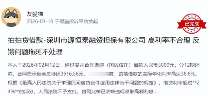 黑猫投诉平台上,商家“拍拍贷”一共积累了超7.6万条用户投诉,近30天里便有815条。其中一条来自3月10日的投诉暗示,该用户在2026年2月12日通过拍拍贷向国民相信借款3000元,分12期还款,经精准接头该笔借款的施行年化利率为38.6%。