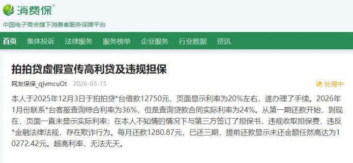 3月15日,另一用户在消费保平台投诉拍拍贷,称我方于2025年12月3日在拍拍贷平台借款12750元,页面暴露利率为20%傍边,2026年1月份关系平台客服查询,发现详细利率高达36%,与贷款契约里的施行利率24%不一致。且拍拍贷在该用户不知情的情况下,订立了该用户与第三方的担保书,收取担保费。